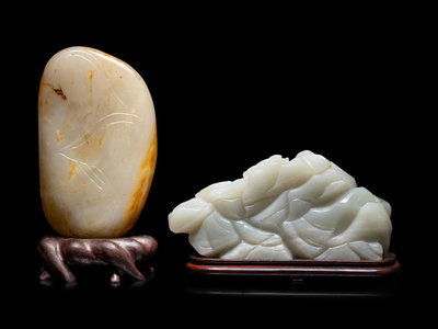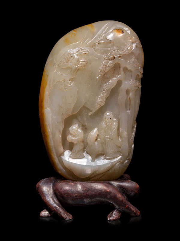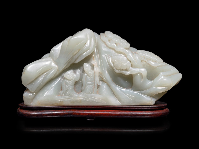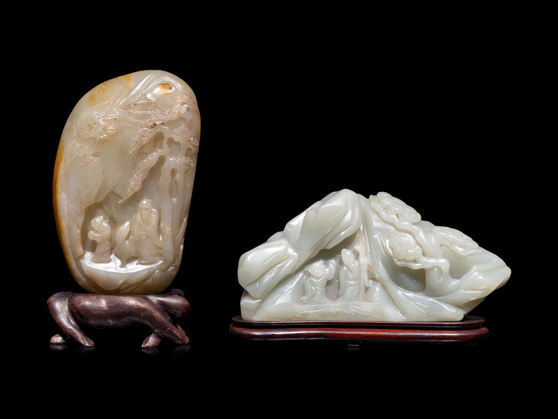 each carved as a scholar and his servant boy under pines in a mountainous scene.