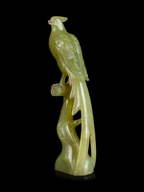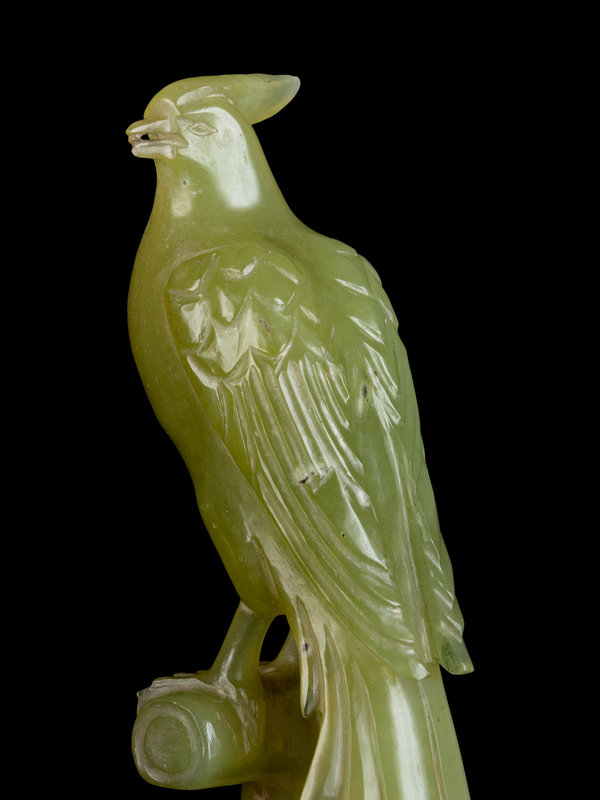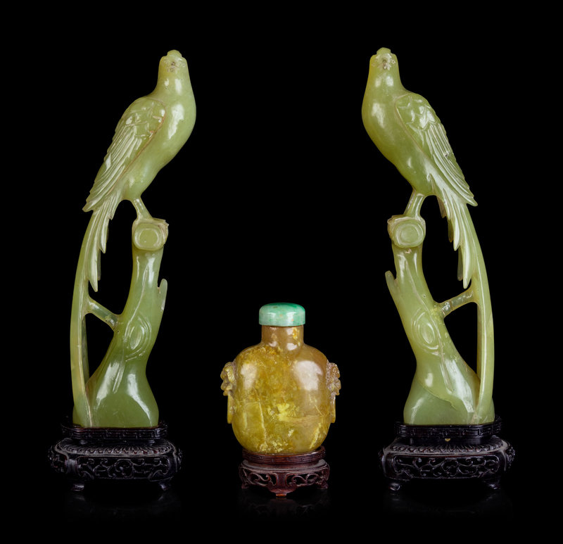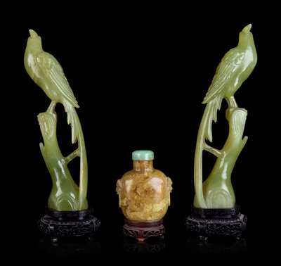 A Chinese Carved Yellow Hardstone Snuff Bottle and A Pair of Chinese Carved Hardstone Figures of Birds