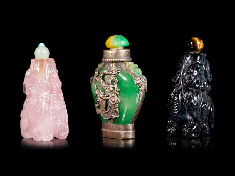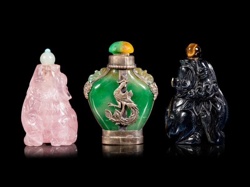 the first a Tibetan silver mounted jadeite example, decorated with sinuous dragons; the second a tiger eye stone fu lion-form example, the third a rose quartz fu lion-form example.