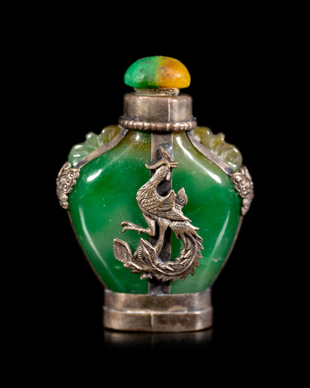 Three Chinese Jadeite and Hardstone Snuff Bottles