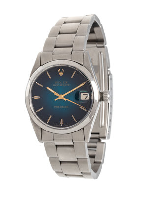 29.00 mm case diameter, blue dial, applied gold baton numerals, date aperture at 3 o'clock with magnifier in crystal, center sweep seconds hand, 17 jewel manual wind movement signed MONTRES ROLEX S.A. GENEVA SWISS, brushed steel brick link bracelet, deployant clasp. 6 5/8 inches inner circumference.