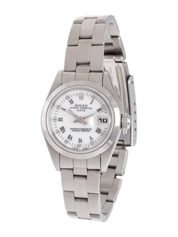 25.00 mm case diameter, white dial, black Roman numerals, center sweep seconds hand, date aperture at 3 o'clock with magnifier in crystal, Cal. 2135 29 jewel self-winding movement signed ROLEX S.A. GENEVA SWISS, brushed brick link bracelet, deployant clasp with Rolex logo. 6 1/2 inches inner circumference.