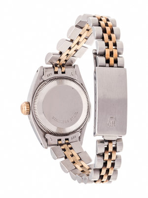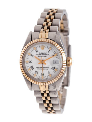 25.00 mm case diameter, white dial, applied gold baton and black Roman numerals, date aperture at 3 o'clock with magnifier in crystal, self-winding movement, stainless steel and yellow gold Jubilee link bracelet, deployant clasp with Rolex logo. 6 1/4 inches inner circumference.