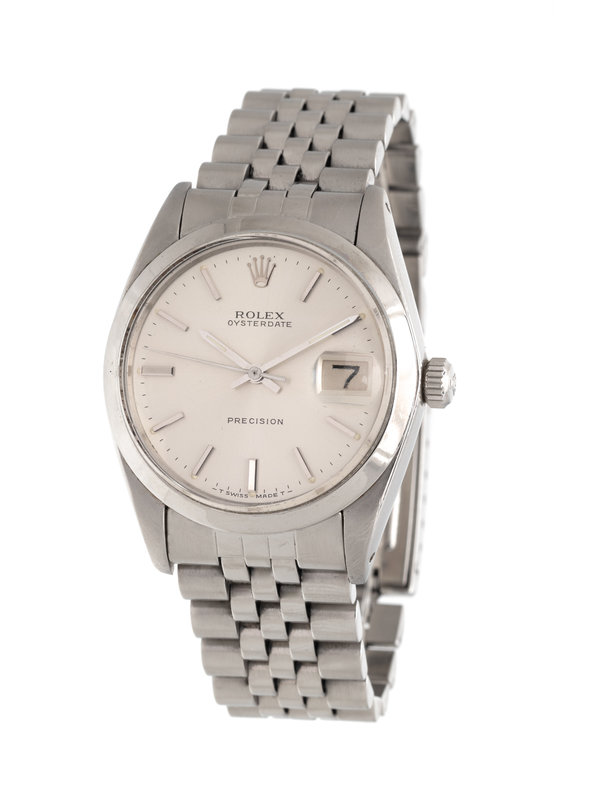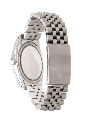 35.00 mm case diameter, matte silvered dial, applied steel baton numerals, date aperture at 3 o'clock with magnifier in crystal, center sweep seconds hand, self-winding movement, steel Jubilee link bracelet, deployant clasp signed ROLEX. 6 7/8 inches inner circumference.