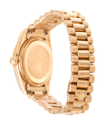 35.00 mm case diameter, champagne dial, applied single cut diamond numerals, center sweep seconds hand, date aperture at 3 o'clock with magnifier in crystal, day aperture at 12 o'clock, self-winding movement, matte and polished yellow gold Jubilee link bracelet, deployant clasp with Rolex logo. 7 inches inner circumference.