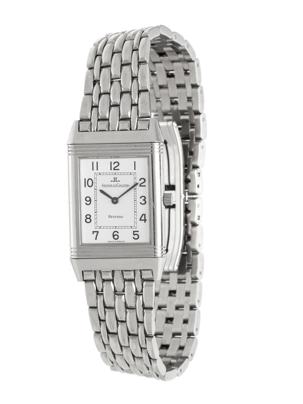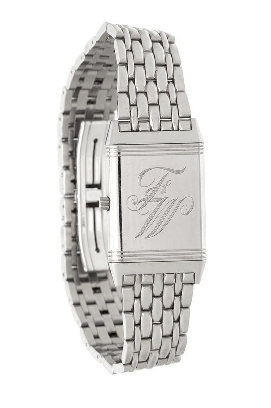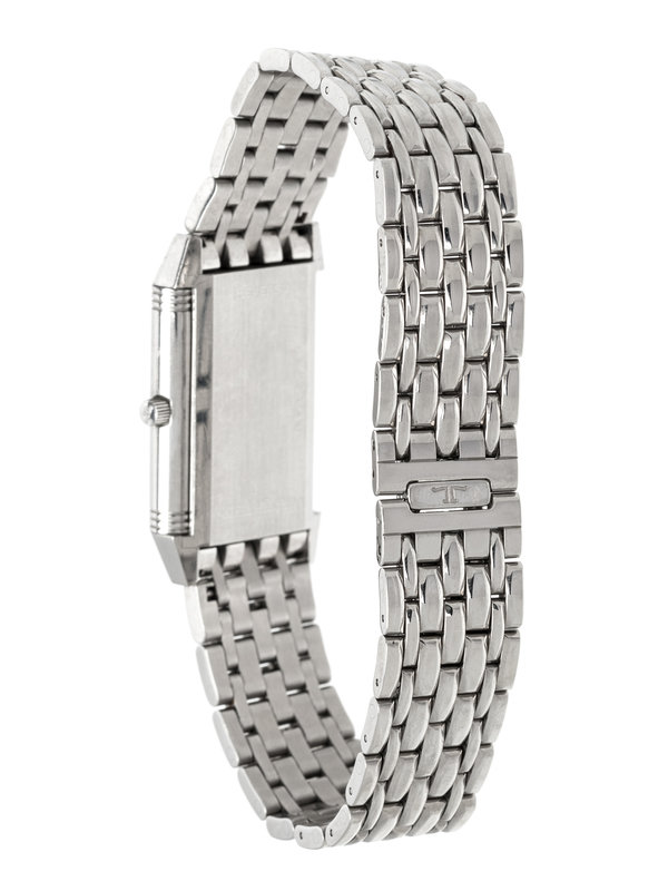 38.00 x 23.00 mm case dimensions inclusive of lugs, two-sided case mounted on a swivel hinge, the face with matte silvered dial, black Arabic numerals, the reverse with monogram engraving, manual wind movement, flexible link bracelet, double deployant clasp with Jaeger-LeCoultre logo. 8 inches inner circumference.