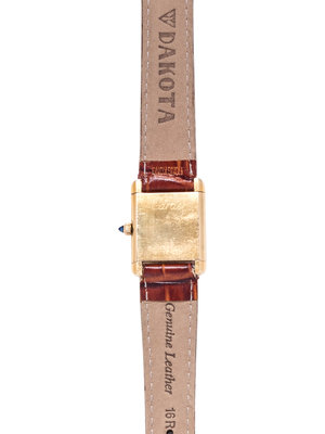 28.00 x 21.00 mm case dimensions inclusive of lugs, white dial, black Roman numerals, 17 jewel manual wind movement signed CARTIER SWISS, brown leather strap, base metal tang buckle. 5 7/8-7 1/2 inches long.