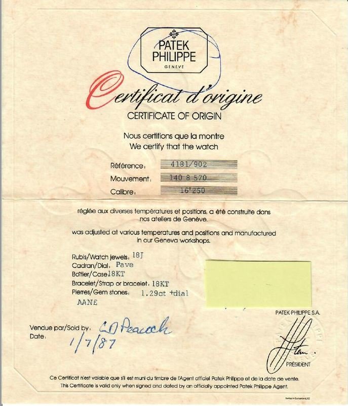 Accompanied by a Patek Philippe Certificate of Origin, 1987.