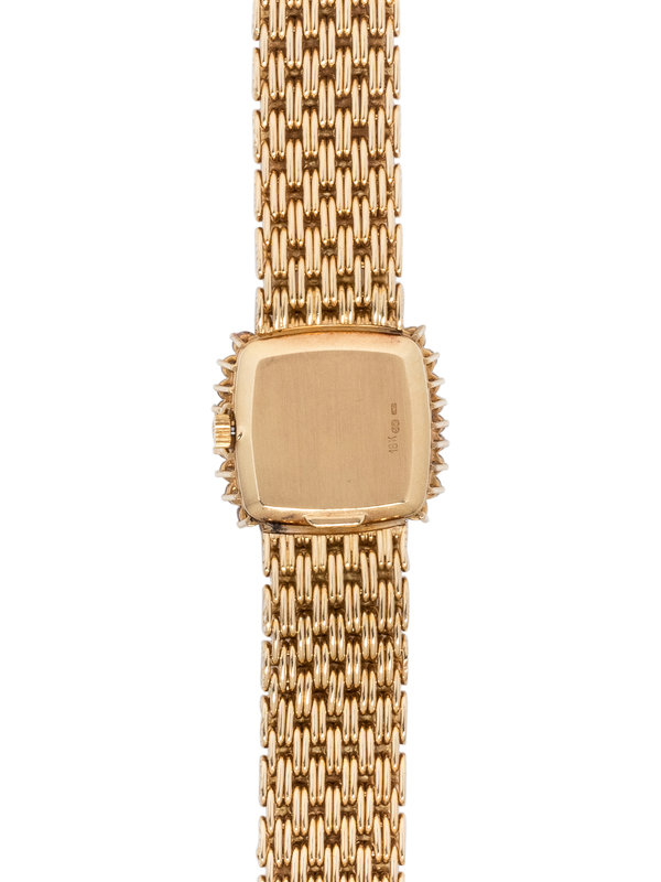 24.00 x 24.00 mm case dimensions, the bezel containing 32 round brilliant cut diamonds weighing 1.29 carats, matte gold dial, applied black and gold baton numerals, Cal. 16-250 18 jewel manual wind movement signed PATEK PHILIPPE GENEVE SWISS, integrated textured mesh link bracelet, fold over bracelet with Patek Philippe logo. 6 1/8-6 1/4 inches long.