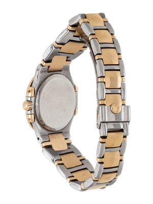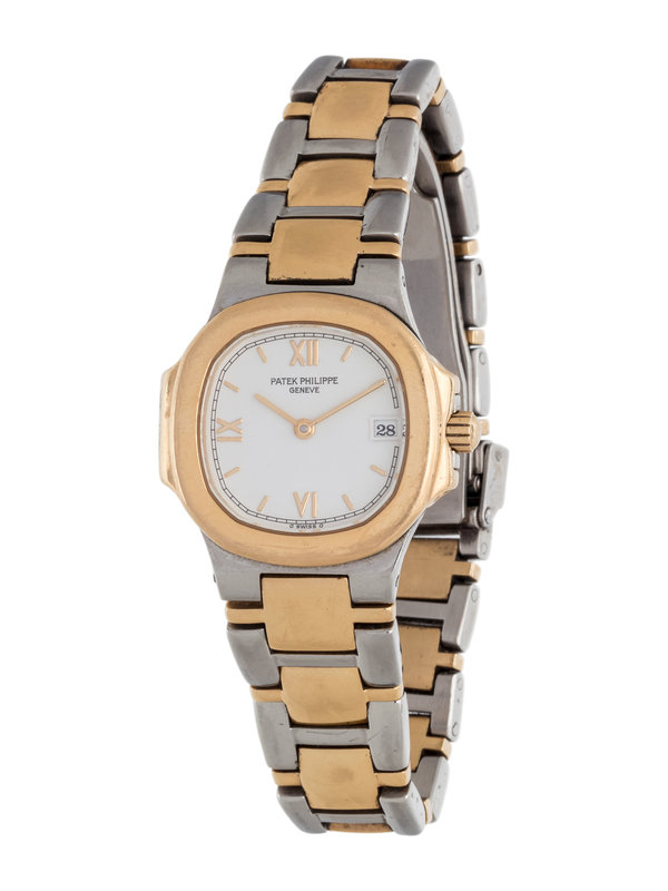 24.00 x 25.00 mm case dimensions, white dial, applied gold baton and Roman numerals, date aperture at 3 o'clock, quartz movement, stainless steel and yellow gold flexible link bracelet, deployant clasp with Patek Philippe logo. 5 3/4 inches inner circumference.