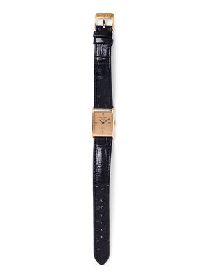 27.00 x 18.00 mm case dimensions inclusive of lugs, striped high polish and matte gold dial, gold dot and black Roman numerals, 18 jewel manual wind movement signed PATEK PHILIPPE GENEVE SWISS, black crocodile strap signed PATEK PHILIPPE, gold tone tang buckle signed TIFFANY & Co. 6-7 1/4 inches long.