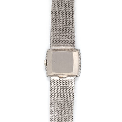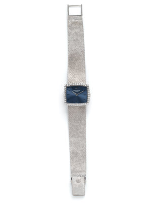 20.00 x 23.00 mm case dimensions, the bezel containing 40 round brilliant cut diamonds, matte blue dial, applied white gold baton numerals, 20 jewel manual wind movement signed PATEK, PHILIPPE & Co SWISS, integrated textured mesh link bracelet, fold over clasp with Patek Philippe logo. 6 3/8-6 1/2 inches long.