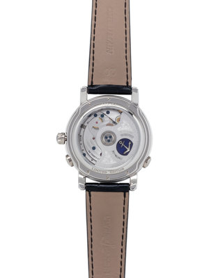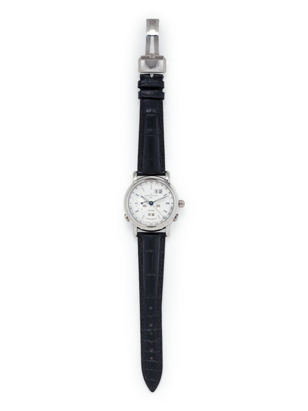 38.00 mm case diameter, wave motif silvered dial, applied platinum baton numerals, subdial for seconds at 9 o'clock, 12 hour indicator at 2 o'clock, central apertures for day, month and date, 34 jewel self-winding movement signed ULYSSE NARDIN PERPETUAL MOVEMENT PATENT No 680 630-2 SWISS, black leather strap signed ULYSSE NARDIN, white gold deployant clasp with Ulysse Nardin logo. 6 1/4-7 3/4 inches long.