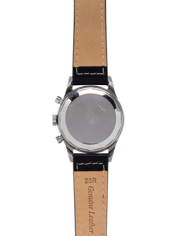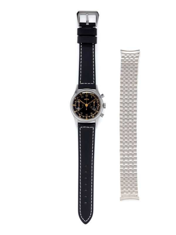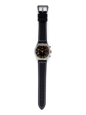 37.00 mm case diameter, black dial, Arabic numerals with outer tachymeter chapter ring, subdials at 3 and 9 o'clock, manual wind jeweled movement signed ANGELUS with chronograph function, black leather strap, base metal tang buckle. 6 1/2-8 inches long.