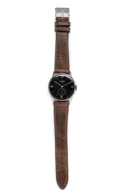 35.00 mm case diameter, black dial, gold baton and Arabic numerals, subdial for seconds at 6 o'clock, Cal. 262 jeweled manual wind movement signed UNIVERSAL GENEVE.