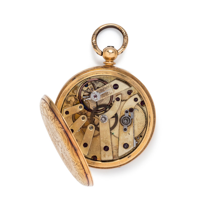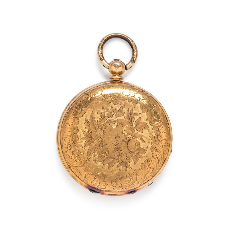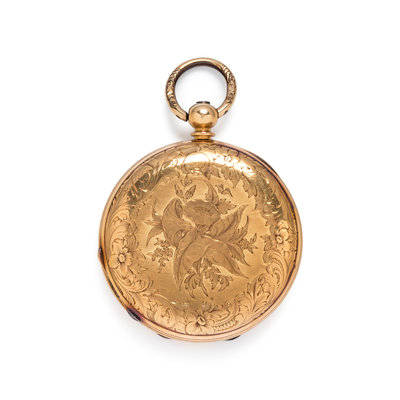 47.00 mm case diameter, white dial, black Roman numerals, subdial for seconds at 6 o'clock, key wound and set gilt movement, engine turned and foliate engraved case.