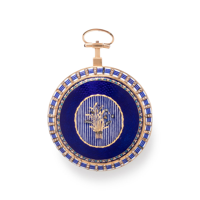50.00 mm case diameter, white dial, black Arabic numerals with outer chapter ring calibrated for minutes, key wound and set gilt verge fusee movement signed Guex a Paris, the bezel and case back containing numerous seed pearls and paste rhinestones and blue and white enamel with central gilt sheaf of wheat.
