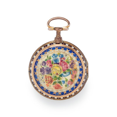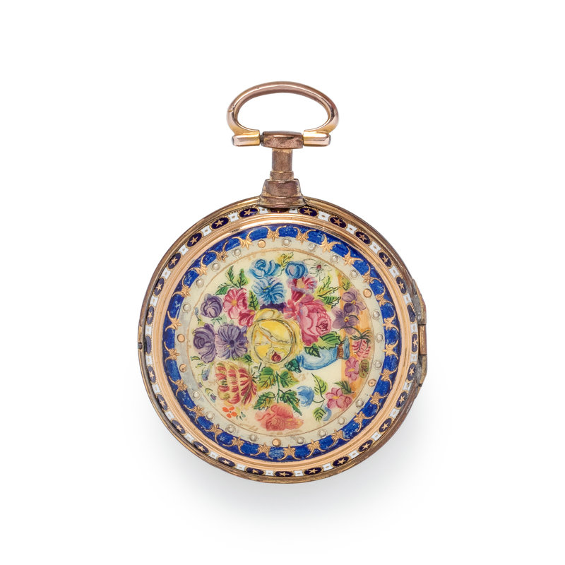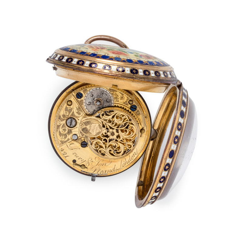 45.00 mm case diameter, white dial, black Roman numerals with outer chapter ring calibrated for minutes, key wound and set verge fusee gilt movement signed Drury & Son Strand London, the bezel and case back with polychrome star and floral decoration.