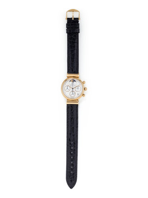 29.00 mm case diameter, white dial, applied gold baton numerals, date aperture between 4 and 5 o'clock, subdials at 3, 6 and 9 o'clock, moonphase indicator at 12 o'clock, quartz movement with chronograph function signed IWC, black leather strap, yellow gold tang buckle signed IWC. 6-7 inches long.