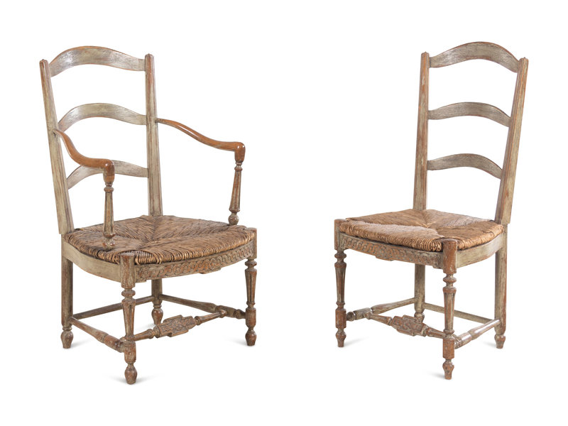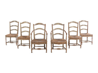 A Set of Six French Provincial Green-Painted Rush-Seat Dining Chairs