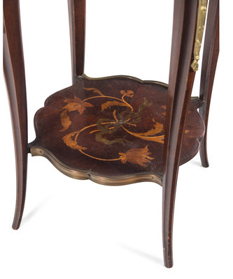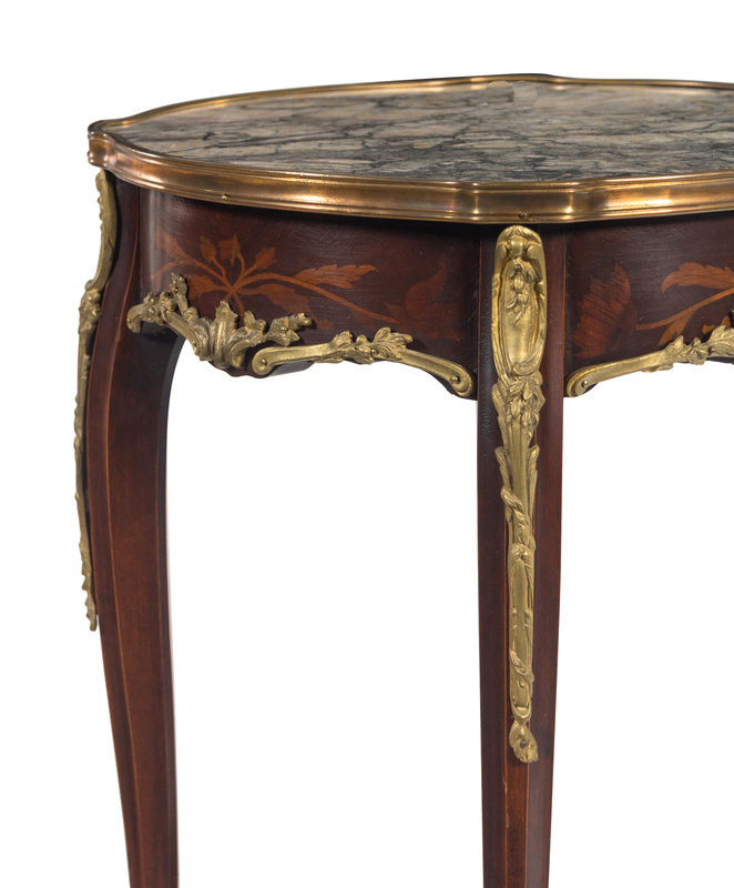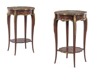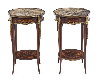 A Pair of Louis XV Style Gilt Bronze Mounted Marquetry Marble-Top Side Tables