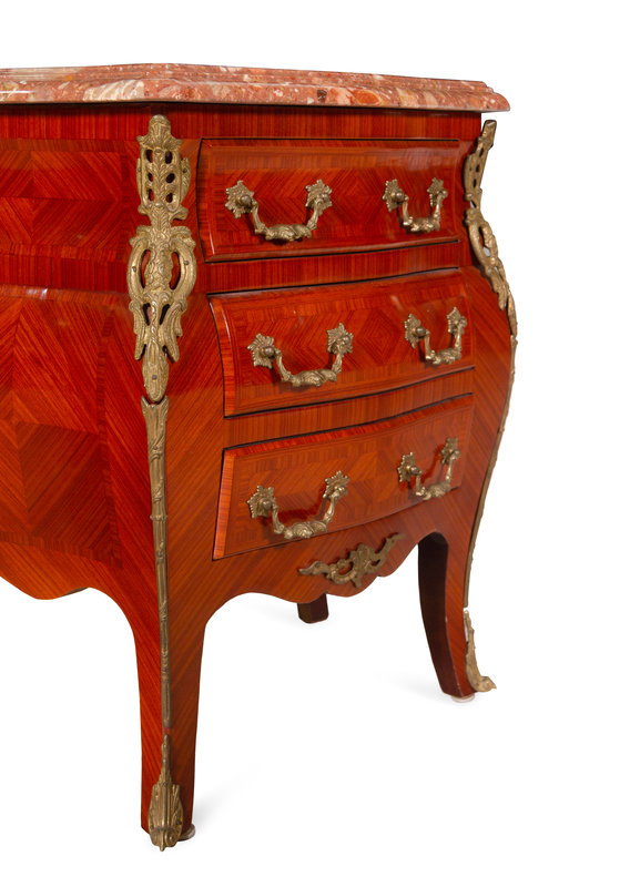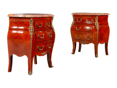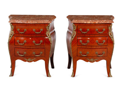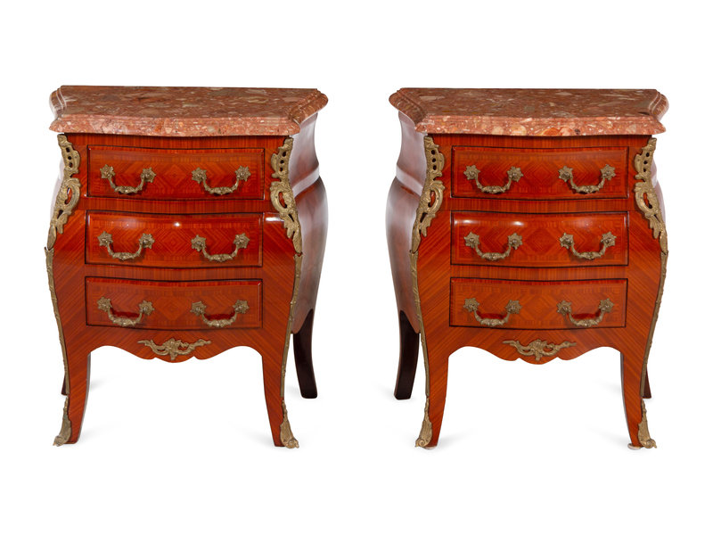 A Pair of Louis XV Style Gilt Metal Mounted Marble-Top Small Commodes