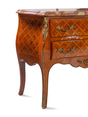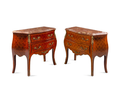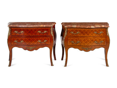 A Near Pair of Louis XV Style Gilt Metal Mounted Parquetry Marble-Top Commodes