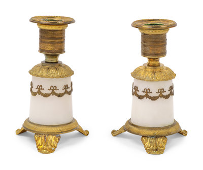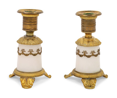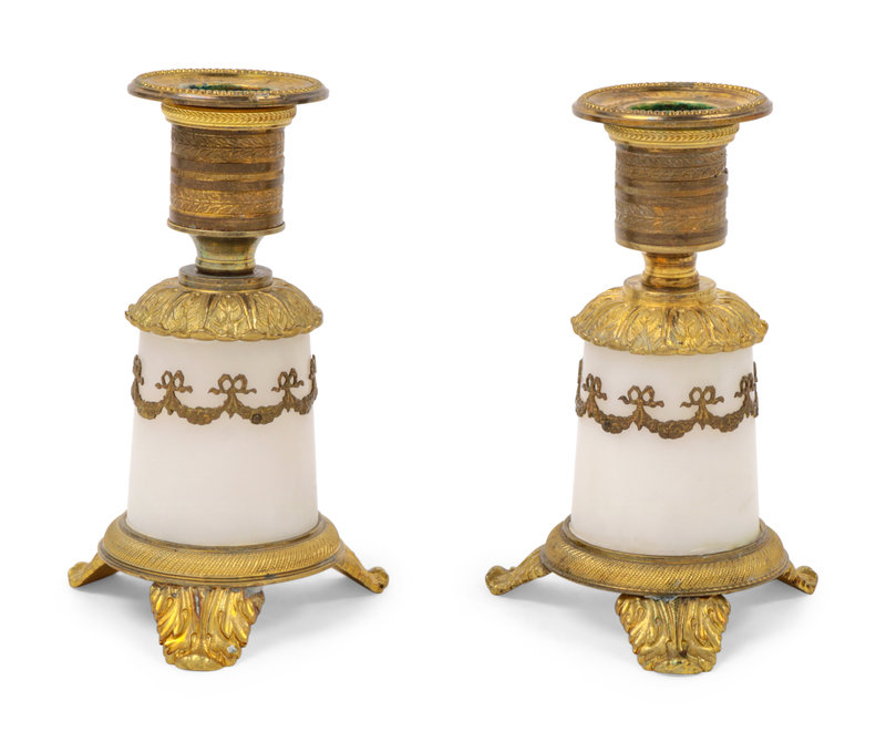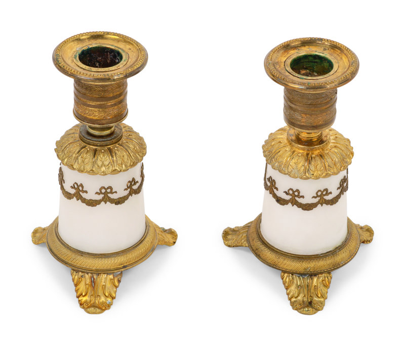 A Pair of Empire Style Gilt Bronze Mounted Marble Candlesticks