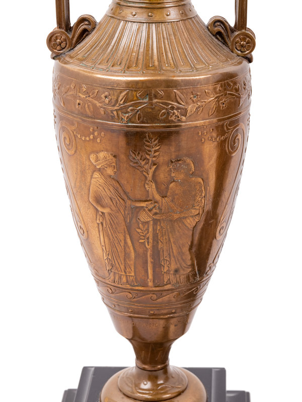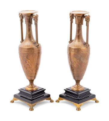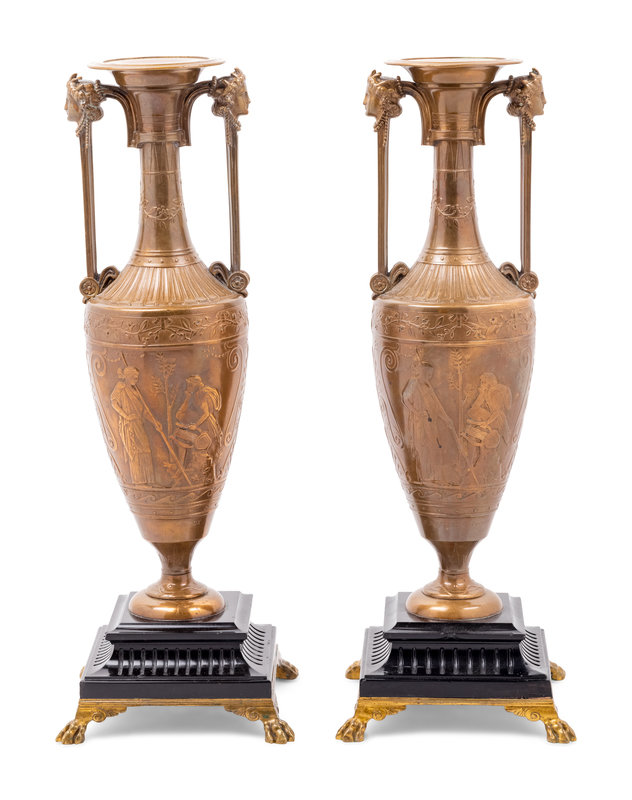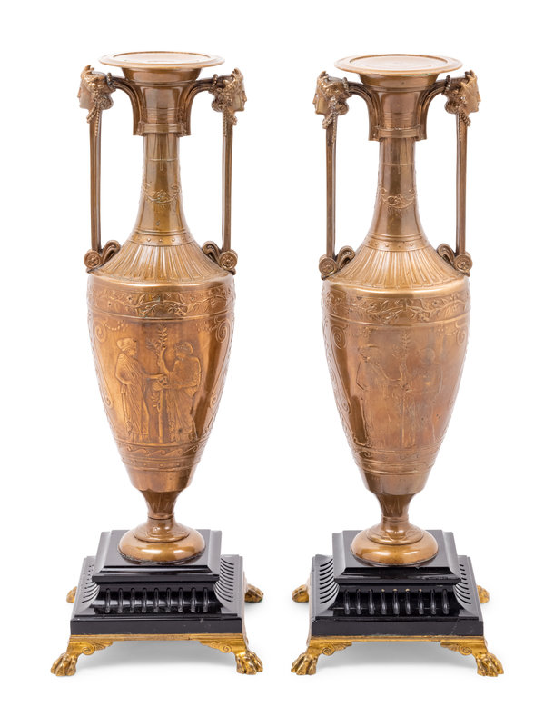 A Pair of French Neoclassical Gilt Bronze Urns by Henry Cahieux (French, 1825-1854)