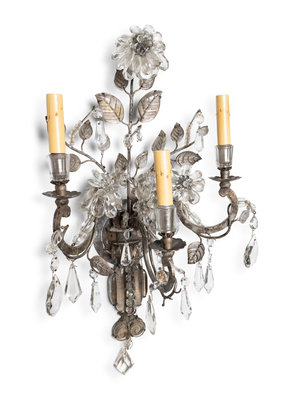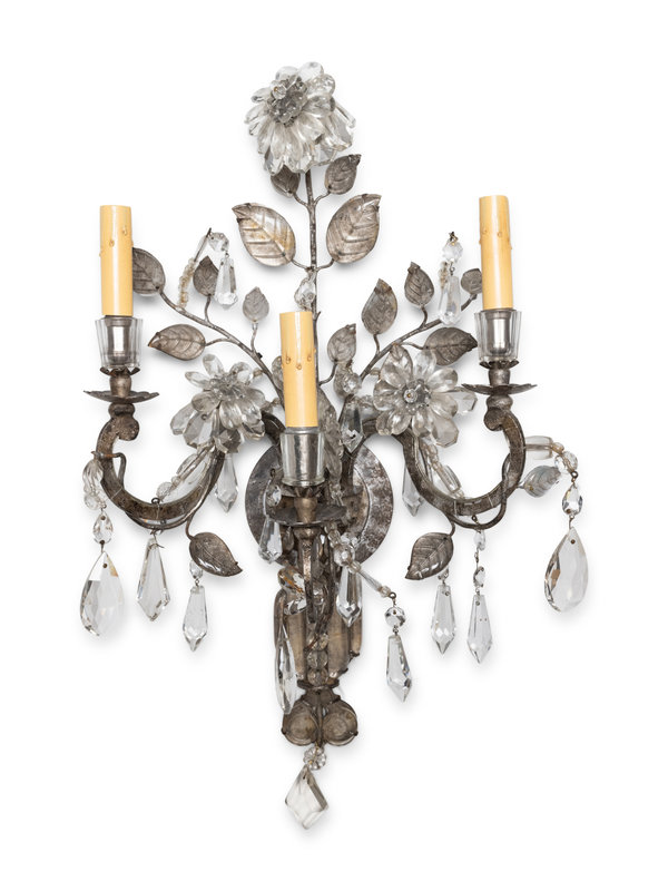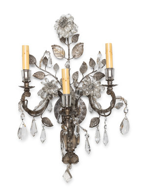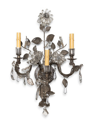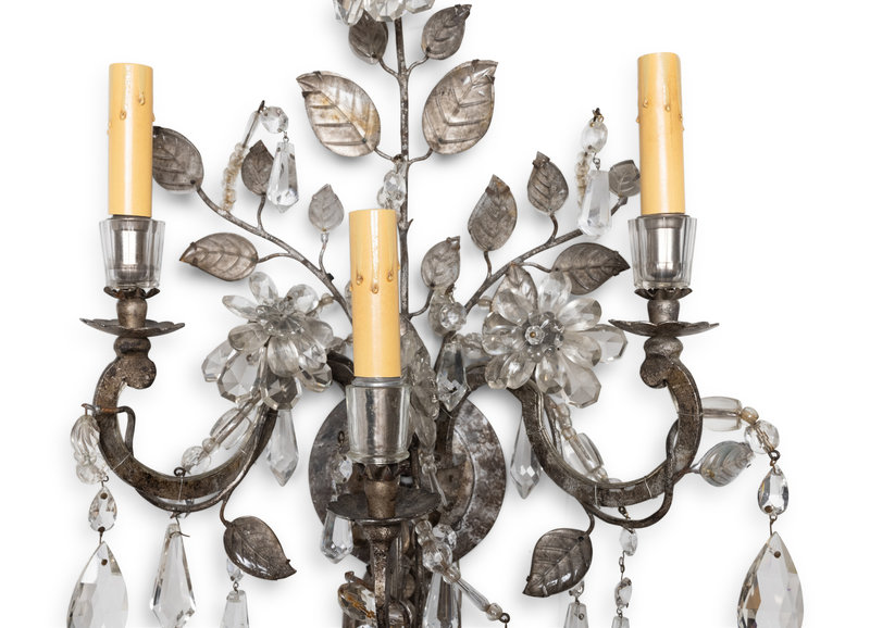 A Pair of Silvered Metal and Glass Three-Light Sconces in the Style of Maison Baguès