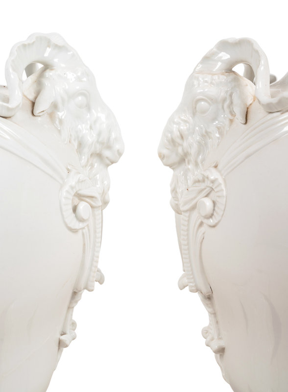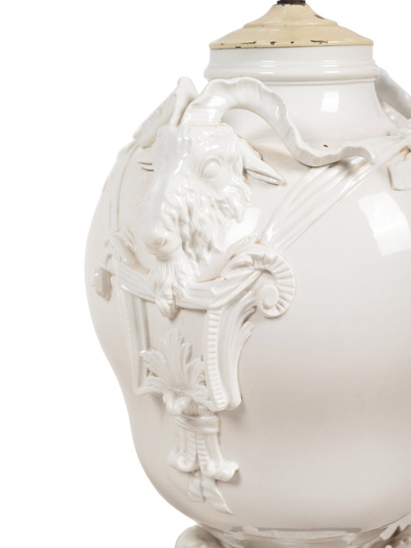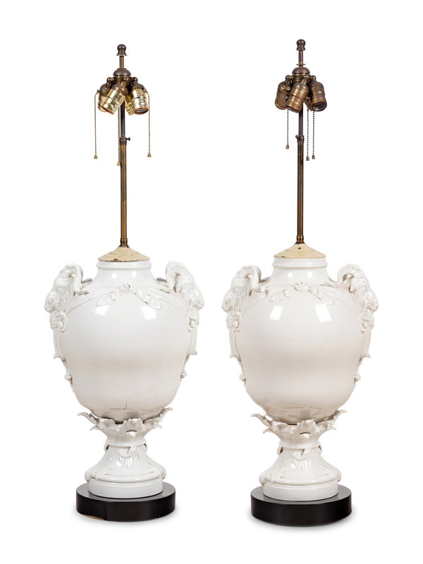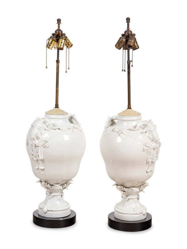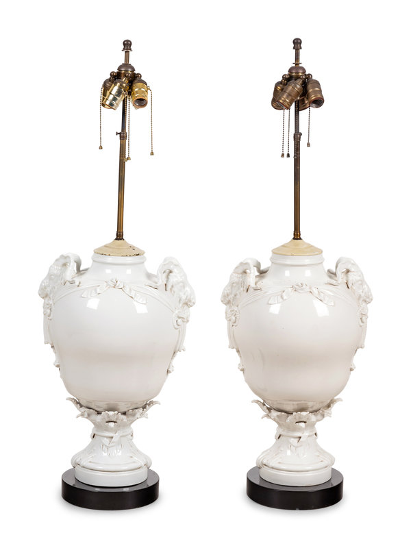 A Pair of German Blanc-de-Chine Porcelain Urns Mounted as Lamps