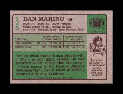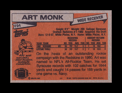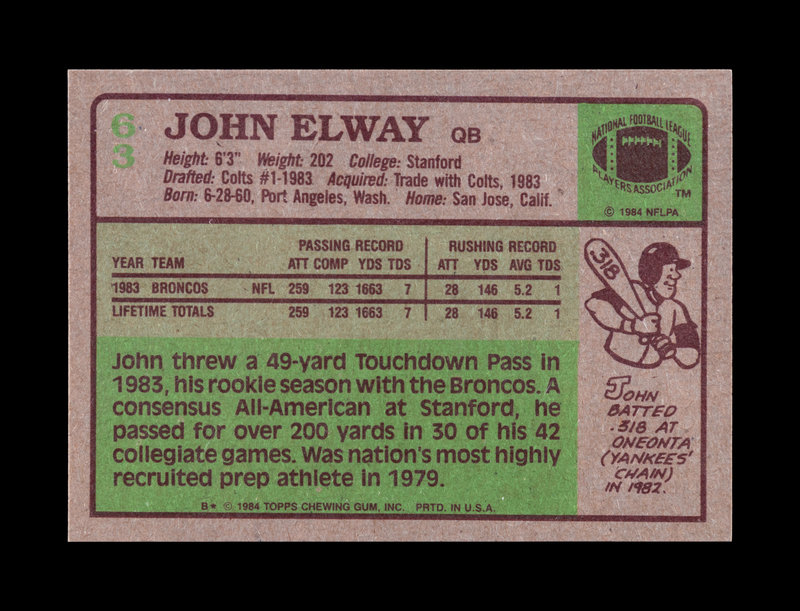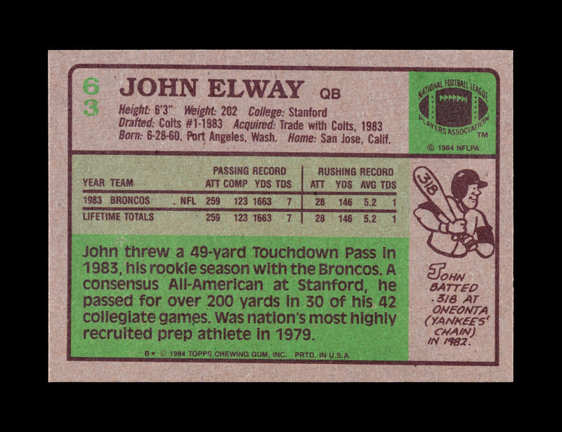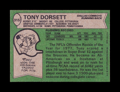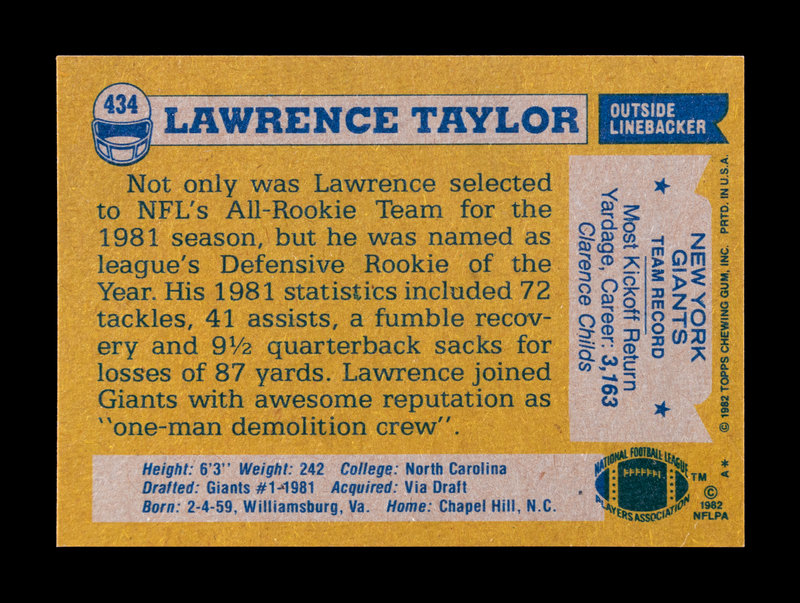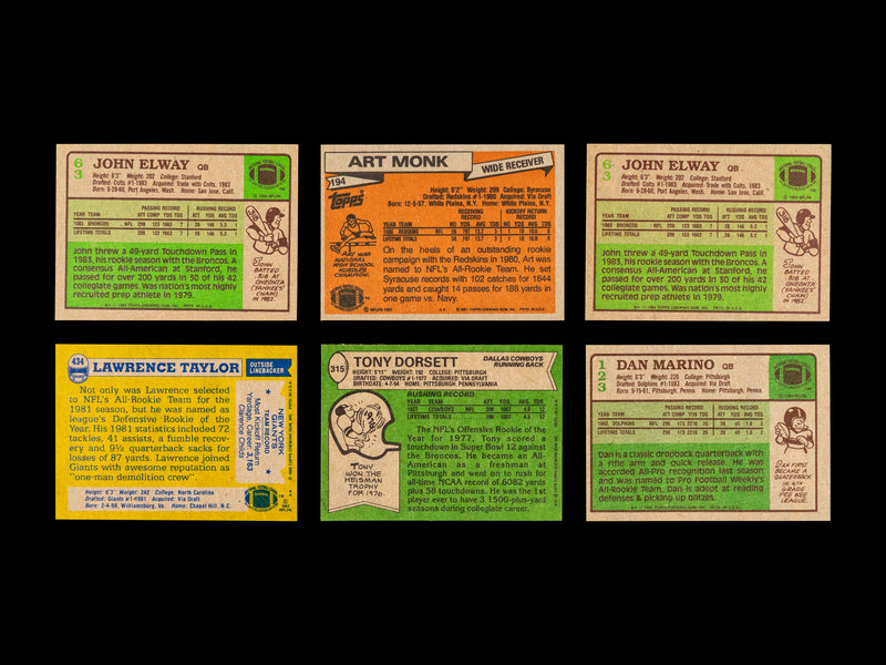 comprising of 1977 Tony Dorsett (No. 315); 1981 Topps Art Monk (No. 194); 1982 Topps Lawrence Taylor (No. 434); 1984 Topps John Elway x2 (No. 63), Dan Marino (No. 123).