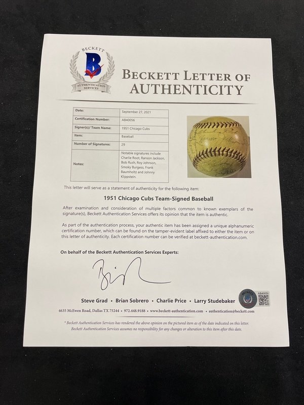 A 1951 Chicago Cubs Team Signed Baseball, 28 Signatures, Including Chuck Connors (BAS Beckett Authentication Services Certified),