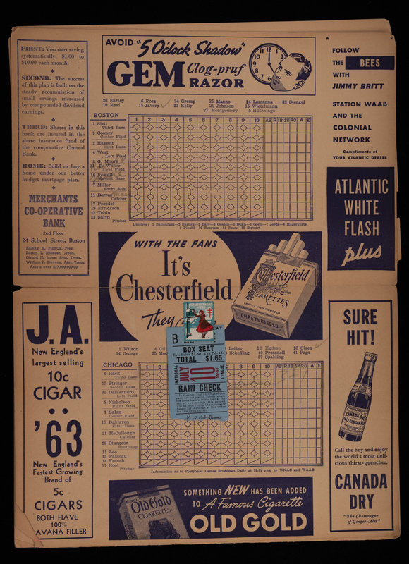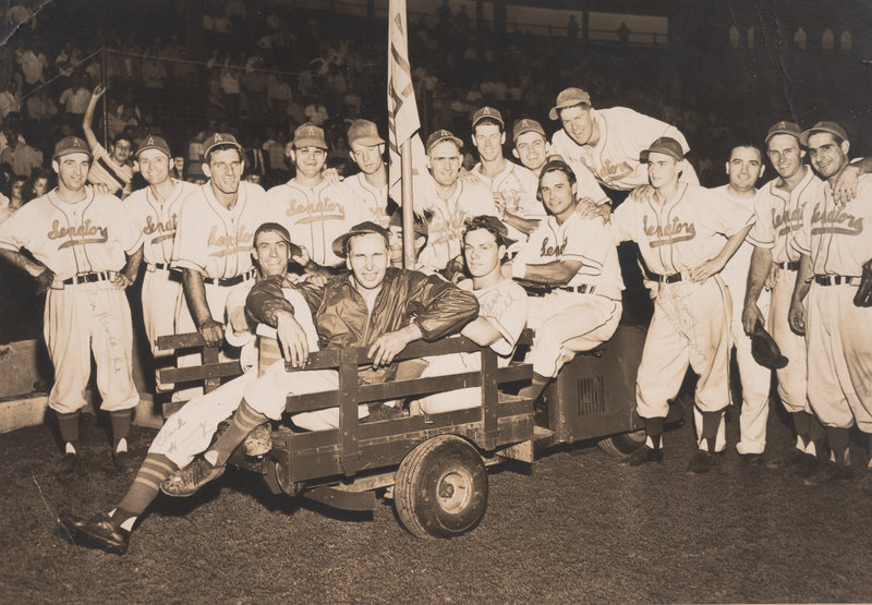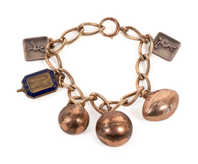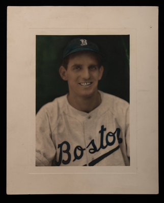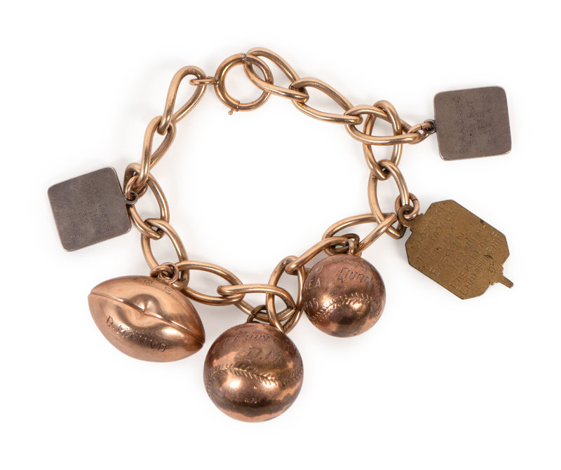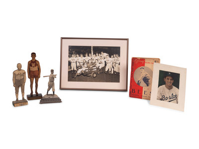 comprising of a colorized George Burke photograph in Boston uniform stamped Geo. Burke 847 Belmont Ave. Chicago on reverse; an original wood cut stand up of Manno in Boston uniform; two wood cut stand ups depicting Manno in his prep days from basketball and football; a 1941 Boston Bees vs. Chicago Cubs Official scorecard and ticket; a framed Albany Senators team photograph measuring 13 1/2 x 17 1/2 inches; and a charm bracelet featuring accomplishments dating to Manno's prep career.