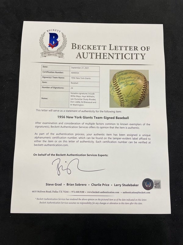 A 1956 New York Giants Team Signed Autograph Baseball Including Willie Mays (BAS Beckett Authentication Services Certified),