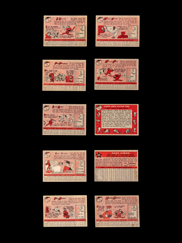 comprising of Alex Kellner (No. 3), Eddie Kasko (No. 8), Jim Rivera (No. 11), George Crowe (No. 12), Jim Lemon (No. 15), Charley Neal (No. 16), Frank Sullivan (No. 18), 1957 Giants (No. 19), Gil McDougald (No. 20), Bill Tuttle (No. 23), Hobie Landrith (No. 24), Don Drysdale (No. 25), Ron Jackson (No. 26), Tex Clevenger (No. 31), Bob Thurman (No. 34), Mike McCormick (No. 37), Dick Gernert (No. 38), Bob Martyn (No. 39), George Kell (No. 40), Dave Hillman (No. 41), Sal Maglie (No. 43), Washington Senators (No. 44), Roger Maris (No. 47), Chico Carrasquel (No. 55), Bill Fischer (No. 56), Art Schult (No. 58), Del Ennis (No. 60), Joe DeMaestri (No. 62), Joe Nuxhall (No. 63), Joe Ginsberg (No. 67), Daryl Spencer (No. 68), Wally Burnette (No. 69), Al Kaline (No. 70), Bud Byerly (No. 72), Pete Daley (No. 73), Don Zimmer (No. 77), Dick Drott (No. 80), Billy O'Dell (No. 84), Valmy Thomas (No. 86), Johnny Kucks (No. 87), Duke Snider (No. 88), Billy Klaus (No. 89), Chuck Tanner (No. 91), Clint Courtney (No. 92), Sandy Amoros (No. 93), Bob Skinner (No. 94), Joe Durham (No. 96), Larry Jackson (No. 97), Bobby Adams (No. 99), Early Wynn (No. 100), Bobby Richardson (No. 101), Dick Schofield (No. 106), Ossie Virgil (No. 107), Jim Landis (No. 108), Herb Plews (No. 109), Earl Torgeson (No. 138), Bobby Morgan (No. 144), Mickey Mantle (No. 150), Cleveland Indians (No. 158), Bob Larsen (No. 161), Al Smith (No. 177), Dave Jolly (No. 183), Jim Bolger (No. 201), Solly Hemus (No. 207), Jerry Kindall (No. 221), Duke Maas (No. 228), Lloyd Merritt (No. 231), Tom Gorman (No. 235), Moose Skowron (No. 240), Dick Littlefield (No. 241), Don Demeter (No. 244), Ray Moore (No. 249), Don Mueller (No. 253), Chicago White Sox (No. 256), Al Pilarcik (No. 259), Frank Malzone (No. 260), Johnny Groth (No. 262), Eddie Bressoud (No. 263), Warren Spahn (No. 270), Rocky Bridges (No. 274), Elston Howard (No. 275), Mack Burk (No. 278), Sam Taylor (No. 281), Harmon Killebrew (No. 288), Randy Jackson (No. 301), Ernie Banks (No. 310), Boston Red Sox (No. 312), Whitey Ford (No. 320), Ike Delock (No. 328), Bob Cerv (No. 329), Pedro Ramos (No. 331), Ruben Gomez (No. 335), Bert Hamric (No. 336), Walt Dropo (No. 338), Stan Lopata (No. 353), Bob Malkmus (No. 356), Roy McMillan (No. 360), Mike Fornieles (No. 361), Earl Battey (No. 364), Ralph Lumenti (No. 369), Yogi Berra (No. 370), Marty Keough (No. 371), Charley Rabe (No. 376), Hank Sauer (No. 378), John Goryl (No. 384), Wilmer Mizell (No. 385), Birdie's Young Sluggers (No. 386), Wally Post (No. 387), Nellie Fox (No. 400), Bobby Gene Smith (No. 402), Curt Simmons (No. 404), Ken Aspromonte (No. 405), Vic Power (No. 406), Baltimore Orioles (No. 408), Tony Taylor (No. 411), Jim Davenport (No. 413), Foster Castleman (No. 416), World Series Batting Foes Mickey Mantle and Hank Aaron (No. 418), Vada Pinson (No. 420), Dixie Howell (No. 421), Gus Triandos (No. 429), Bobby Thomson (No. 430), Pancho Herrera (No. 433), Whitey Herzog (No. 438), Ray Monzant (No. 447), Gene Fodge (No. 449), Hal Griggs (No. 455), Bob Schmidt (No. 468), Don Ferrarese (No. 469), All-Star Managers Casey Stengel, Fred Haney (No. 475), Frank Malzone All-Star (No. 481), Hank Aaron All-Star (No. 488) and Bob Turley (No. 493).