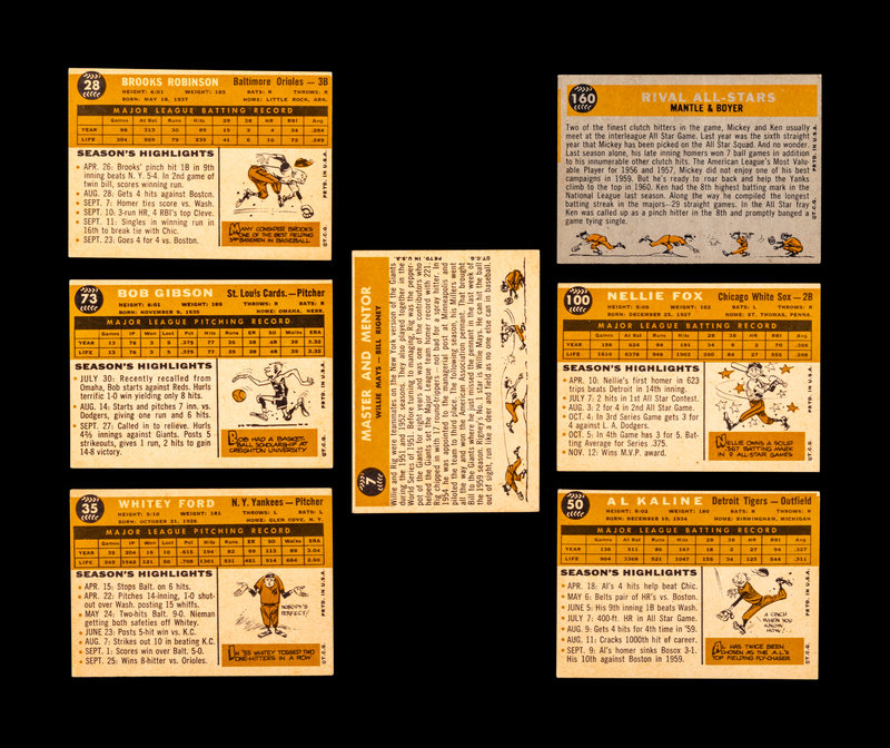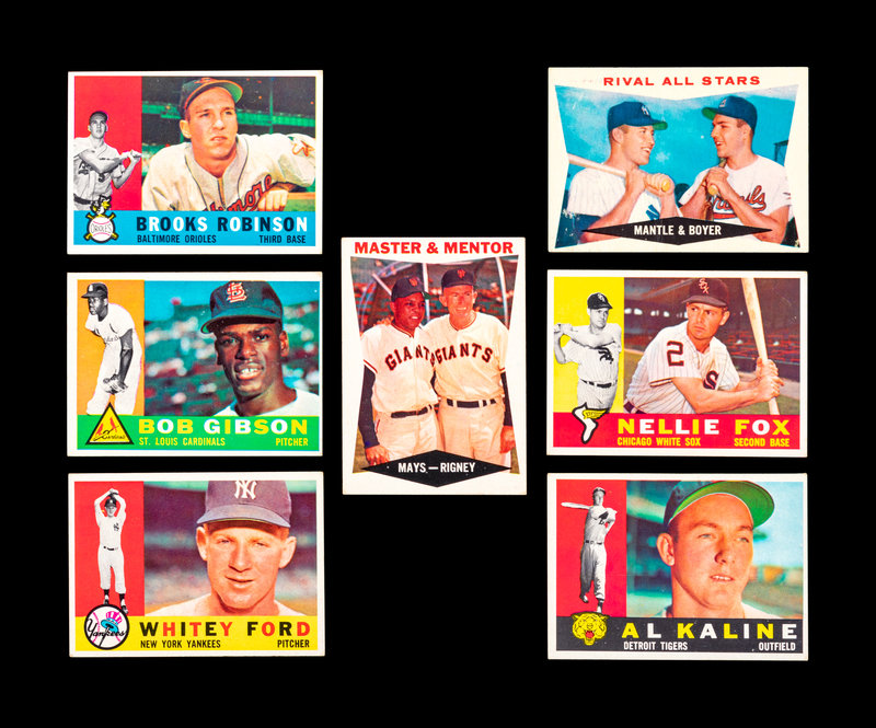 1960 Topps: Early Wynn (No. 1), Roman Mejias (No. 2), Joe Adcock (No. 3), Bob Purkey (No. 4), Wally Moon (No. 5), Lou Berberet (No. 6), Master and Mentor (No. 7), Bud Daley (No. 8), Faye Throneberry (No. 9), Norm Siebern (No. 11), Milt Pappas (No. 12), Wally Post (No. 13), Jim Grant (No. 14), Pete Runnels (No. 15), Ernie Broglio (No. 16), Johnny Callison (No. 17), Los Angeles Dodgers (No. 18), Brooks Robinson (No. 28), Clem Labine (No. 29), Tito Francona (No. 30), Sammy Esposito (No. 31), Sophomore Stalwarts (No. 32), Tom Morgan (No. 33), George Anderson (No. 34), Whitey Ford (No. 35), Russ Nixon (No. 36), Bill Bruton (No. 37), Jerry Casale (No. 38), Earl Averill (No. 39), Joe Cunningham (No. 40), Barry Latman (No. 41), Hobie Landrith (No. 42), Washington Senators (No. 43), Bobby Locke (No. 44), Roy McMillan (No. 45), Jack Fisher (No. 46), Don Zimmer (No. 47), Hal Smith (No. 48), Curt Raydon (No. 49), Al Kaline (No. 50), Jim Coates (No. 51), Dave Philley (No. 52), Jackie Brandt (No. 53), Mike Fornieles (No. 54), Bill Mazeroski (No. 55), Steve Korcheck (No. 56), Win Savers (No. 57), Gino Cimoli (No. 58), Juan Pizarro (No. 59), Gus Triandos (No. 60), Eddie Kasko (No. 61), Roger Craig (No. 62), George Strickland (No. 63), Elston Howard (No. 65), Bob Trowbridge (No. 66), Jose Pagan (No. 67), Dave Hillman (No. 68), Billy Goodman (No. 69), Lou Burdette (No. 70), Marty Keough (No. 71), Detroit Tigers (No. 72), Bob Gibson (No. 73), Walt Moryn (No. 74), Vic Power (No. 75), Bill Fischer (No. 76), Hank Foiles (No. 77), Bob Grim (No. 78), Walt Dropo (No. 79), Johnny Antonelli (No. 80), Russ Snyder (No. 81), Ruben Gomez (No. 82), Tony Kubek (No. 83), Hal Smith (No. 84), Frank Lary (No. 85), Dick Gernert (No. 86), John Romonosky (No. 87), John Roseboro (No. 88), Hal Brown (No. 89), Bobby Avila (No. 90), Bennie Daniels (No. 91), Whitey Herzog (No. 92), Art Schult (No. 93), Leo Kiely (No. 94), Frank Thomas (No. 95), Ralph Terry (No. 96), Ted Lepcio (No. 97), Gordon Jones (No. 98), Lenny Green (No. 99), Nellie Fox (No. 100), Bob Miller (No. 101), Kent Hadley (No. 102), Dick Farrell (No. 103), Dick Schofield (No 104), Larry Sherry (No. 105), Billy Gardner (No. 106), Carl Willey (No. 107), Pete Daley (No. 108), Cletis Boyer (No. 109), Cal McLish (110), Jack Harshman (No. 112), Bob Skinner (No. 113), Ken Aspromonte (No. 114), Fork and Knuckler (No. 115), Jim Rivera (No. 116), Tom Borland Rookie Star (No. 117), Don Dillard Rookie Star (No. 122), Chuck Estrada Rookie Star (No. 126), Bob Hartman Rookie Star (No. 129), Frank Herrera Rookie Star (No. 130), Manuel Javier Rookie Star (No. 133), Deron Johnson Rookie Star (No. 134), Jim Kaat Rookie Star (No. 136), Lou Klimchock Rookie Star (No. 137), Jim Proctor Rookie Star (No. 141), Bill Short Rookie Star (No. 142), Al Spangler Rookie Star (No. 143), Ted Wieand Rookie Star (No. 146), Billy Pierce (No. 150), San Francisco Giants (No. 151), Bobby Thomson (No. 153), Jim Davenport (No. 154), Charlie Neal (No. 155), Rocky Nelson (No 157), Rival All Stars Mantle and Boyer (No. 160), Sammy Taylor (No. 162), Cincinnati Reds (No. 164), Willie Kirkland (No. 172), Billy Martin (No. 173), Cleveland Indians (No. 174), Pedro Ramos (No. 175), Vada Pinson (No. 176), Johnny Kucks (No. 177), Rip Coleman (No. 179), Eli Grba (No. 183), Dave Sisler (No. 186), Gene Woodling (No. 190), Ron Kline (No. 197), Jerry Lynch (No. 198), Felipe Alou (No. 287), Nelson Chittum (No. 296), Jim Baxes (No. 318), Joe Koppe (No. 319), Red Schoendienst (No. 335), Case Wise (No. 342), Cincy Clouters (No. 352), Bill White (No. 355), Joe DeMaestri (No. 358), Herb Score (No. 360), Frank House (No. 372), Bob Buhl (No. 374).