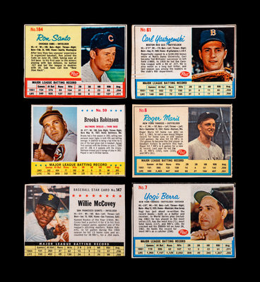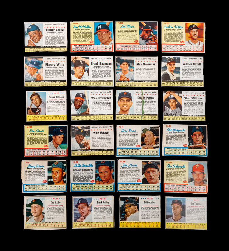 comprising of the following issues 1961 Hector Lopez (No. 12), Frank Baumann (No. 34), Camilio Pascual (No. 99), Wes Covington (No. 108), Wilmer Mizell (No. 140), Willie McCovey (No. 147), Stan Williams (No. 162), Maury Wills (No. 164), Alex Grammas (No. 177); 1962 Tony Kubek (No. 4), Roger Maris (No. 6 AD BACK), Yogi Berra (No. 7), Dick Brown (No. 21), Ron Hansen (No. 30), Gus Triandos (No. 33), Milt Pappas (No. 34), Jim Landis (No. 50), Minnie Minoso (No. 51, Don Buddin (No. 59), Carl Yastrzemski (No. 61), Earl Averill (No. 80), Zoilo Versalles (No. 86), Lenny Green (No. 87), Jim Lemon (No. 89), Gene Stephens (No. 95), Jim Gilliam (No. 112), Gene Freese (No. 118), Ed Kasko (No. 119), Gus Bell (No. 120), Joey Jay (No. 124), Roy McMillan (No. 148), Carlton Willey (No. 155), Lee Maye (No. 156), Carl Sawatski (No. 162), Elroy Face (No. 177), Ron Santo (No. 184), Andre Rogers (No. 185), Richie Ashburn (No. 186), Clay Dalrymple (No. 197); 1963 Lee Thomas (No. 30), Rocky Colavito (No. 50), Hank Aguirre (No. 54), Brooks Robinson (No. 59), Chuck Hinton (No. 93), Felipe Alou (No. 107), Tom Haller (No. 108), Bob Purkey (No. 134), Frank Bolling (No. 149).