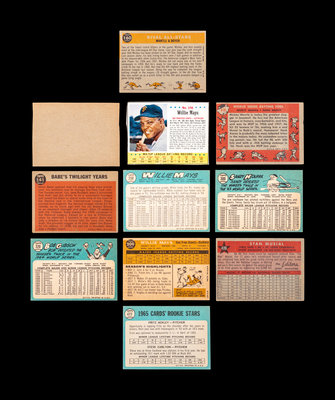 comprising of 1958 Topps World Series Batting Foes Mickey Mantle & Hank Aaron (No. 418), Stan Musial All Star (No. 476), 1960 Rival All Stars Mickey Mantle & Ken Boyer (No. 160), Willie Mays (No. 200), 1962 Topps Babe Ruth Special (No. 141); 1962 Post Cereal Hank Aaron (No. 149), 1963 Post Cereal Willie Mays (No. 106); 1965 Topps Willie Mays (No. 250), Sandy Koufax (No. 300), Bob Gibson (No. 320), Cards 1965 Rookie Stars Steve Carlton (No, 477). Conditions average FAIR-VG.