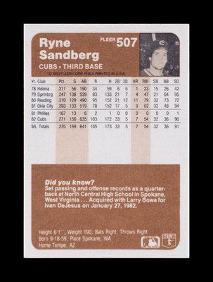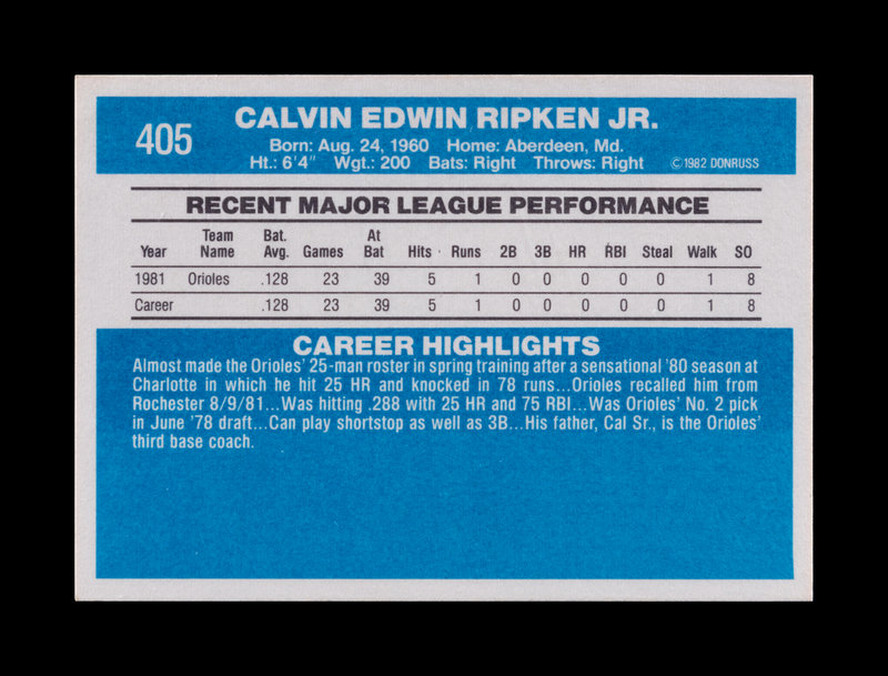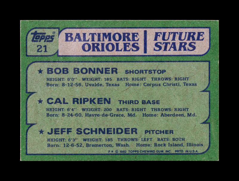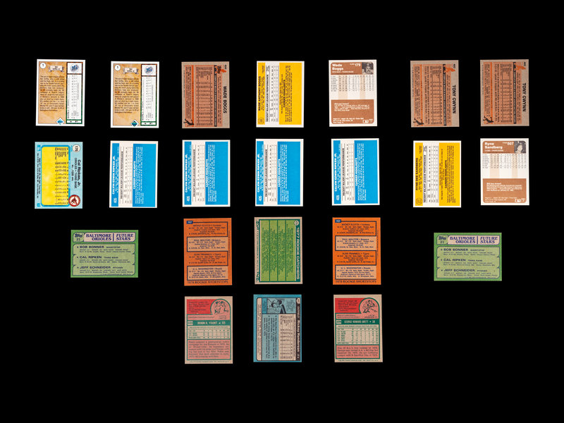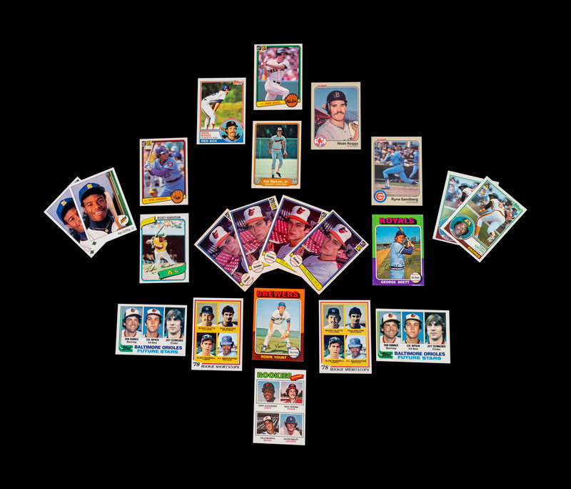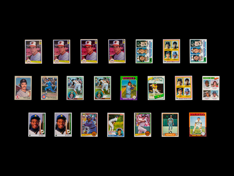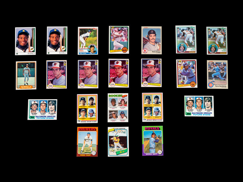 comprising of 1975 Topps Robin Yount (No. 223), George Brett (No. 228); 1977 Topps Dale Murphy (No. 476); 1978 Topps Rookie Shortstops Paul Molitor, Alan Trammel x2 (No. 707); 1980 Topps Rickey Henderson (No. 482); 1982 Donruss Cal Ripken Jr. x4 (No. 405); 1982 Fleer Cal Ripken Jr. (No. 176); 1982 Topps Cal Ripken Jr. x2 (No. 21); 1983 Fleer Wade Boggs (No. 179), Ryne Sandberg (No. 507); 1983 Donruss Ryne Sandberg (No. 277), Wade Boggs (No. 586); 1983 Topps Tony Gwynn x2 (No. 482), Wade Boggs (No. 498); 1989 Upper Deck Ken Griffey Jr. x2 (No. 1). Condition average EX-MT.
