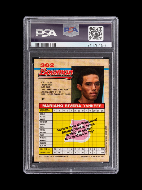 A 1992 Bowman Mariano Rivera Rookie Baseball Card No. 302 (PSA 10, GEM MINT)