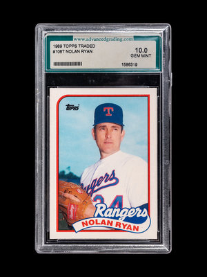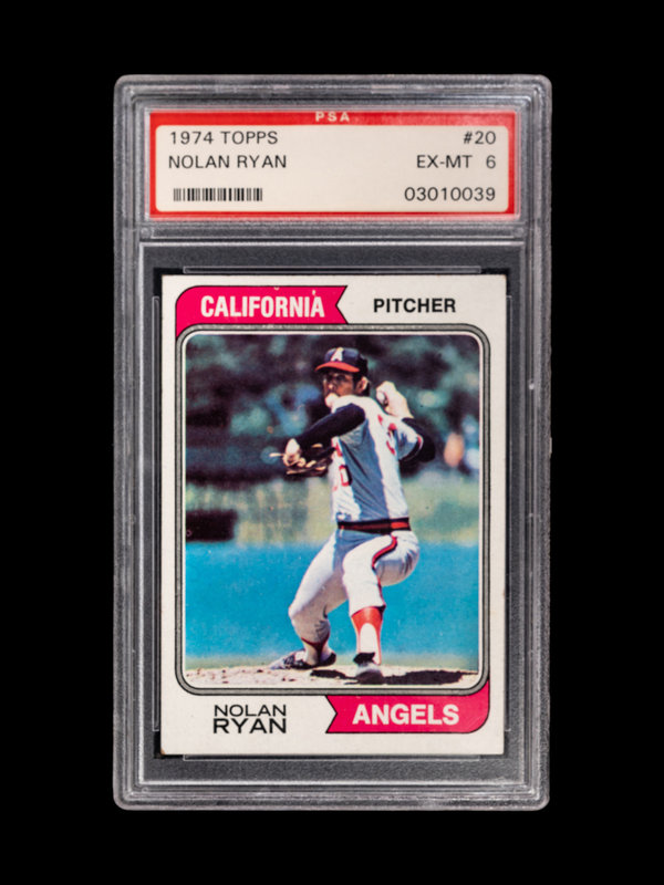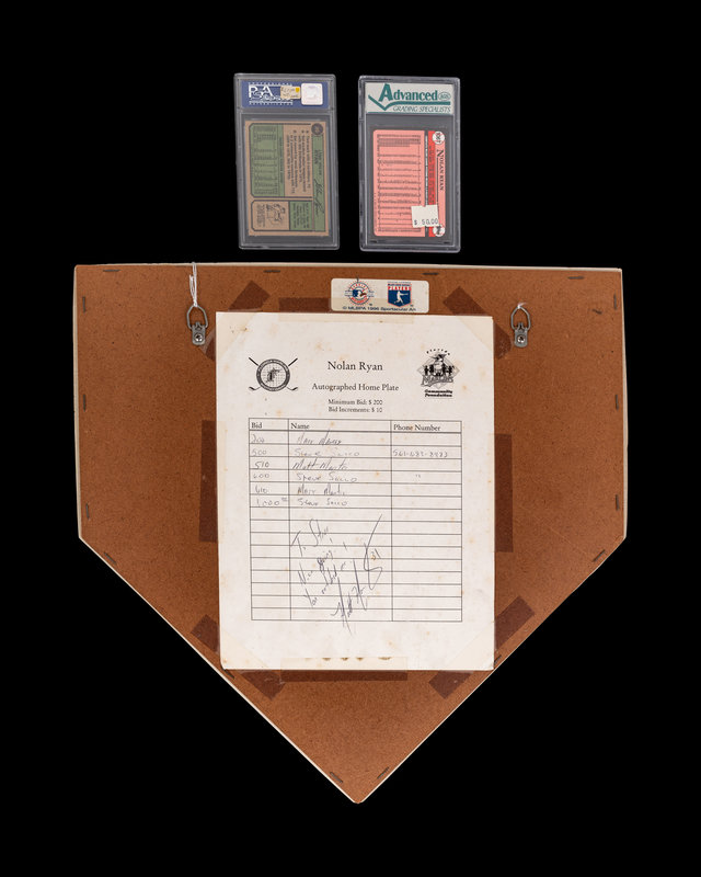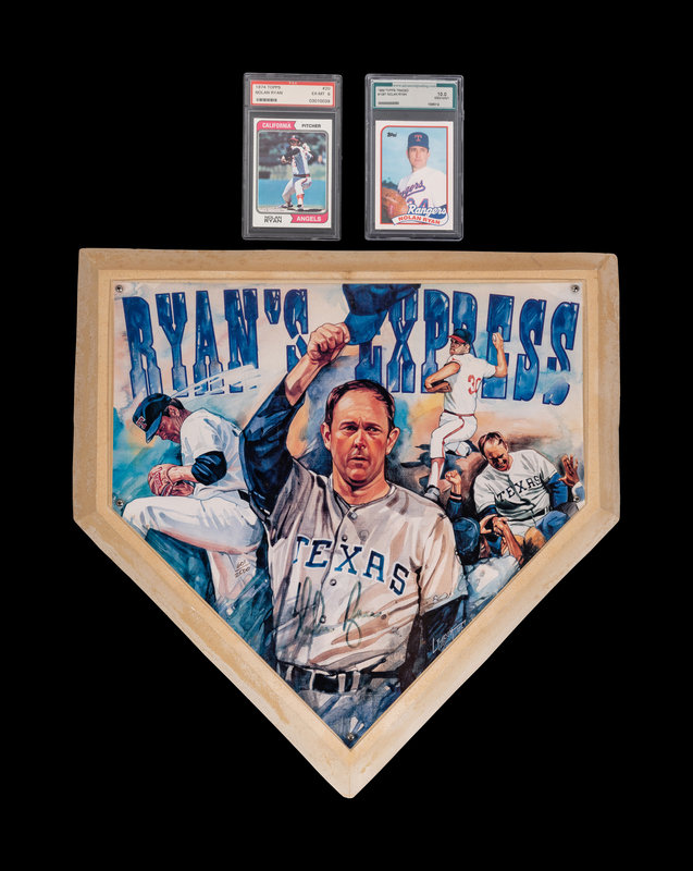 comprising of a 1996 Sportacular Art Home Plate inscribed "Nolan Ryan" in blue, a 1974 Topps card No. 20 (PSA 6 EX-MT) and a 1989 Topps Traded card No. 106T (Advanced Grading 10 Gem Mint).