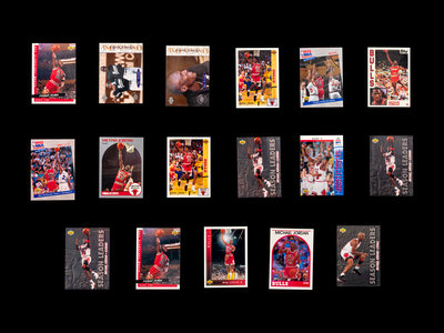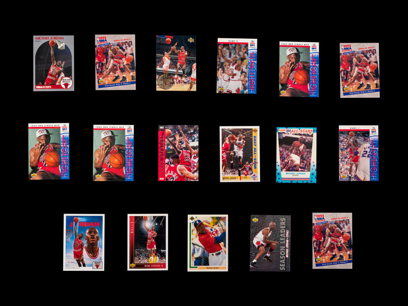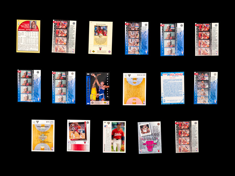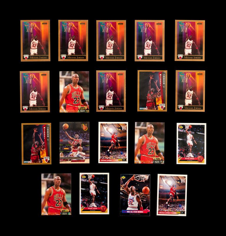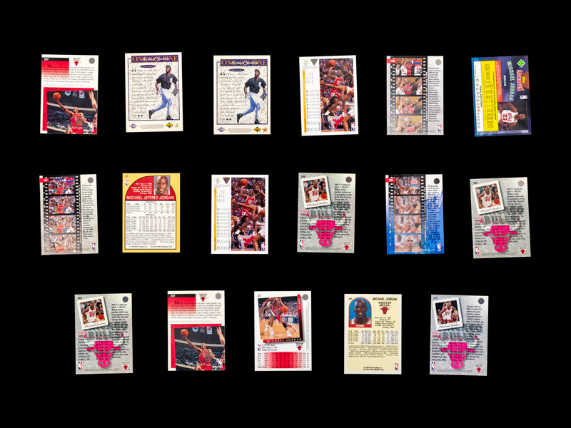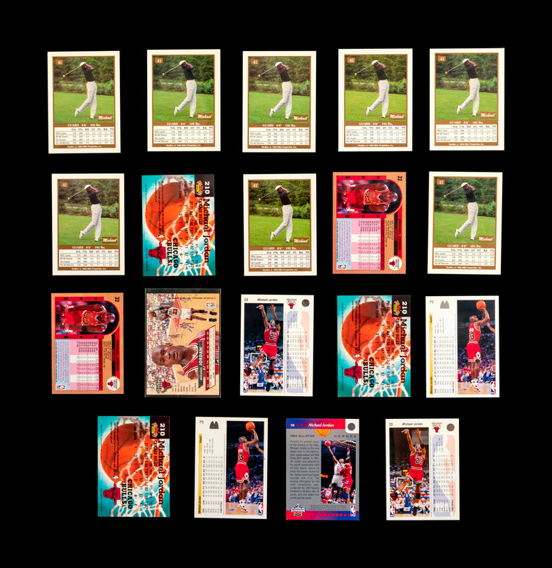 comprising of 1989 Fleer Michael Jordan Sticker (No. 3), 1989 Hoops Michael Jordan (No. 200), 1990 Hoops Michael Jordan (No. 65); 1990 Skybox Michael Jordan x8 (No. 41); 1991 Upper Deck Baseball Michael Jordan SP1 (PSA 5); 1991 Upper Deck Michael Jordan (No. 44), Michael Jordan All-Star (No. 69), Chicago Bulls Checklist (No. 75); 1992 Fleer Michael Jordan x2 (No. 32); 1992 Topps Stadium Club Michael Jordan x3 (No. 210); 1992 Topps Archives Michael Jordan (No. 52); 1992 Upper Deck Michael Jordan x2 (No. 23); 1992 Upper Deck McDonalds Michael Jordan x2 (No. P5); 1992 Upper Deck All-Star Weekend Michael Jordan (No. 15); 1993 Fleer Ultra Michael Jordan (No. 30); 1993 Upper Deck Michael Jordan (No. 23), Michael Jordan Season leaders x3 (No. 166), x2 (No. 171), 1993 NBA Playoffs x3 (No. 180), (No. 187), (No. 193), 1993 NBA Finals (No. 198), x2 (No. 201), x3 (No. 204), NBA Signature Moves (No. 237) Scoring Titles (No. SP3); 1995 Upper Deck Minor League Baseball Michael Jordan '94 Season (No. 7), Michael Jordan The Future (No. 10); 1995 Upper Deck Michael Jordan (No. 137).
