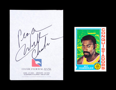 comprising of an autographed Chase Federal Bank notepaper inscribed "Peace Wilt Chamberlain" in black in ink and a 1974 Topps basketball card No. 250.
