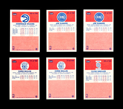 A Group of Six 1986 Fleer Rookie Basketball Cards (Including Clyde Drexler, Joe Dumars, Chris Mullin, Dominique Wilkins),