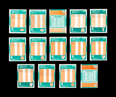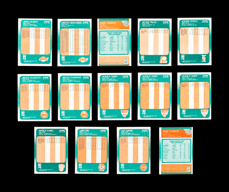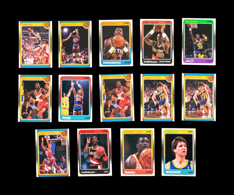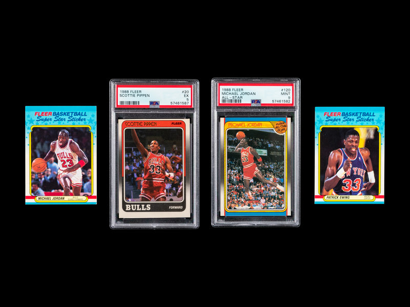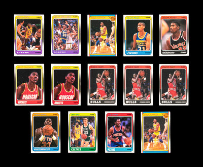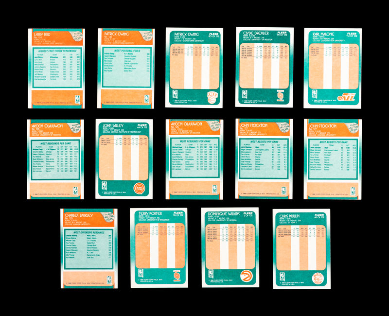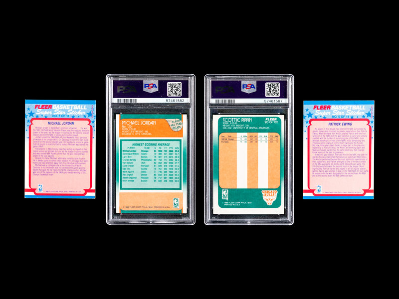 comprising of Dominque Wilkins (No. 5), Larry Bird (No. 9), Horace Grant x3 (No. 16), Scottie Pippen No. 120 (PSA 5 EX), Joe Dumars (No. 40), John Salley (No. 44), Chris Mullin (No. 48), Hakeem (Akeem) Olajuwon x2 (No. 53), Reggie Miller (No. 57), Kareem Abdul-Jabbar (No. 64), Magic Johnson (No. 70), Patrick Ewing (No. 80) x 2, Clyde Drexler (No. 92), Jerome Kersey (No. 95), Terry Porter (No. 96), Karl Malone (No. 114), Michael Jordan All-Star No. 120 (PSA 9 MINT), Magic Johnson All-Star (No. 123), Larry Bird All-Star (No. 124), Hakeem (Akeem) Olajuwon x2 (No. 126), John Stockton x2 (No. 127), Charles Barkley (No. 129), Patrick Ewing (No. 130); Patrick Ewing Sticker (No. 5), Michael Jordan Sticker (No. 7).