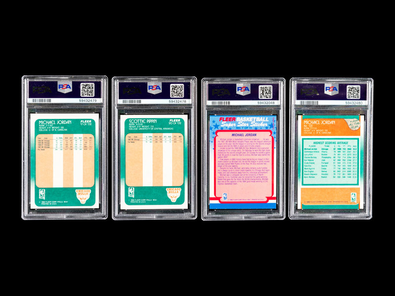 comprising of a Michael Jordan card No. 17 (PSA 7 NM), Jordan All-Star card No. 120 (PSA 8 NM-MT), a Scottie Pippen rookie card No. 20 (PSA 8 NM-MT) and a Jordan sticker No. 7 (PSA 4 VG-EX).