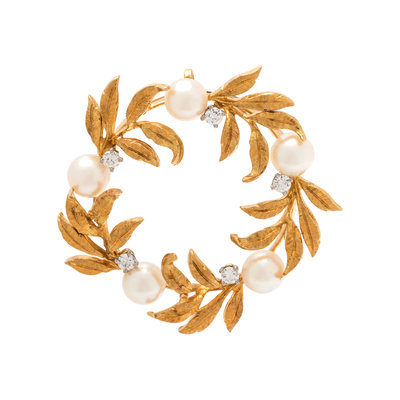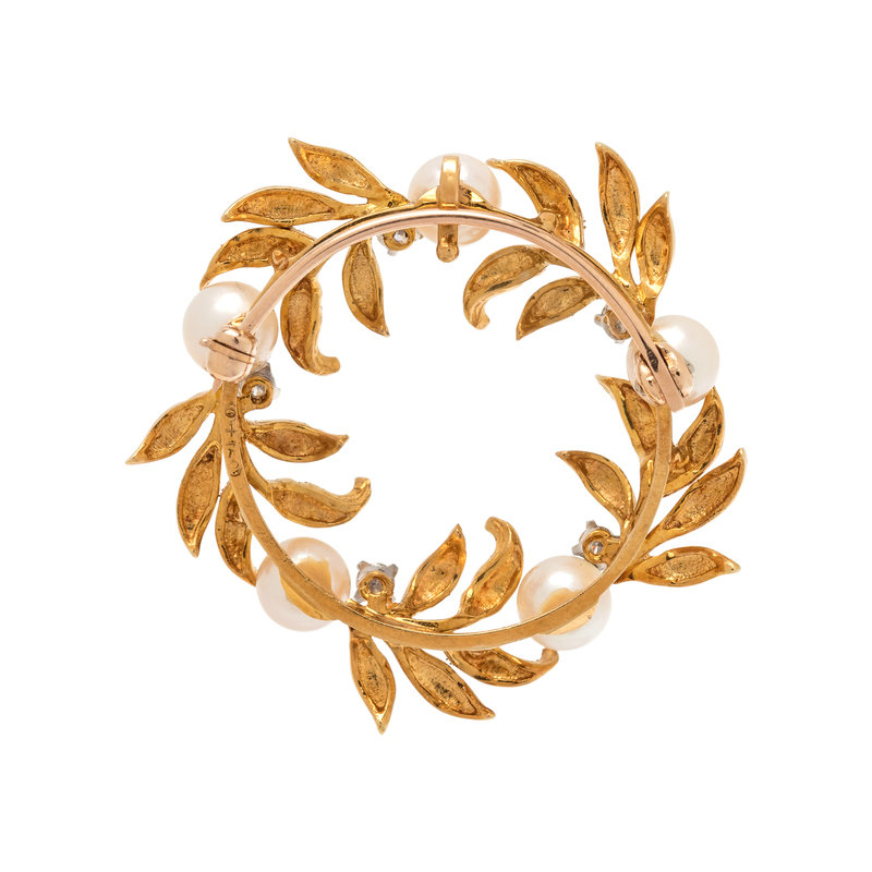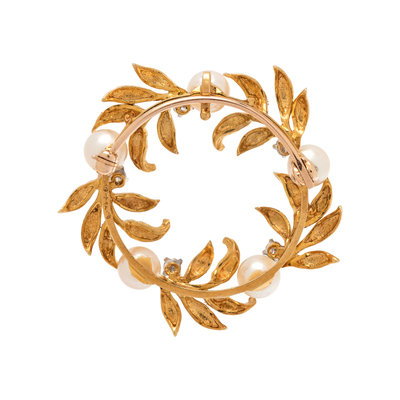 Consisting of a circle design with textured gold leaves containing five cultured pearls and five round brilliant cut diamonds weighing approximately 0.30 carat total. 1 3/8 inches wide.