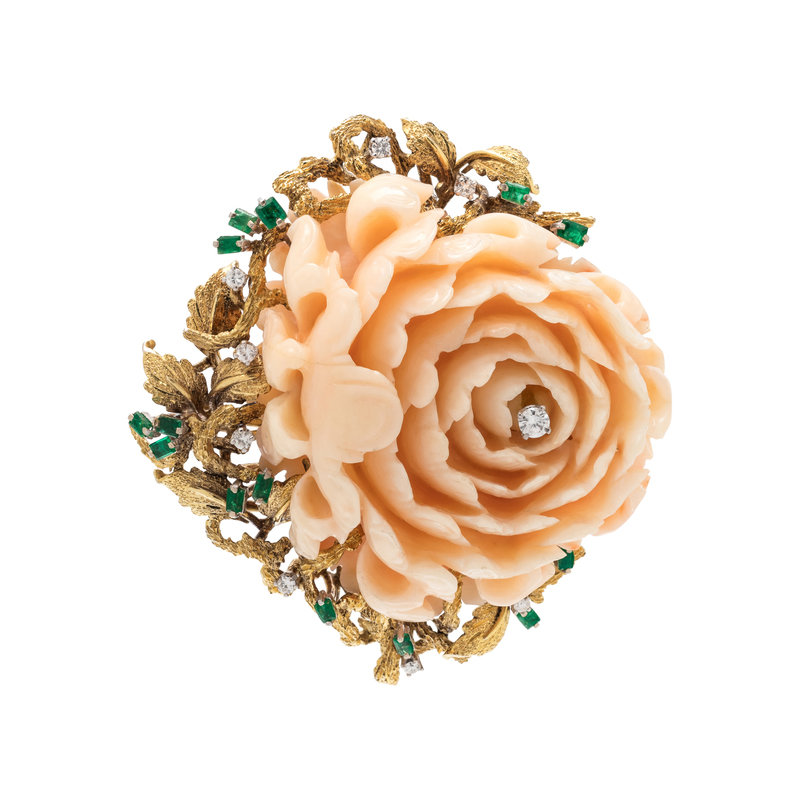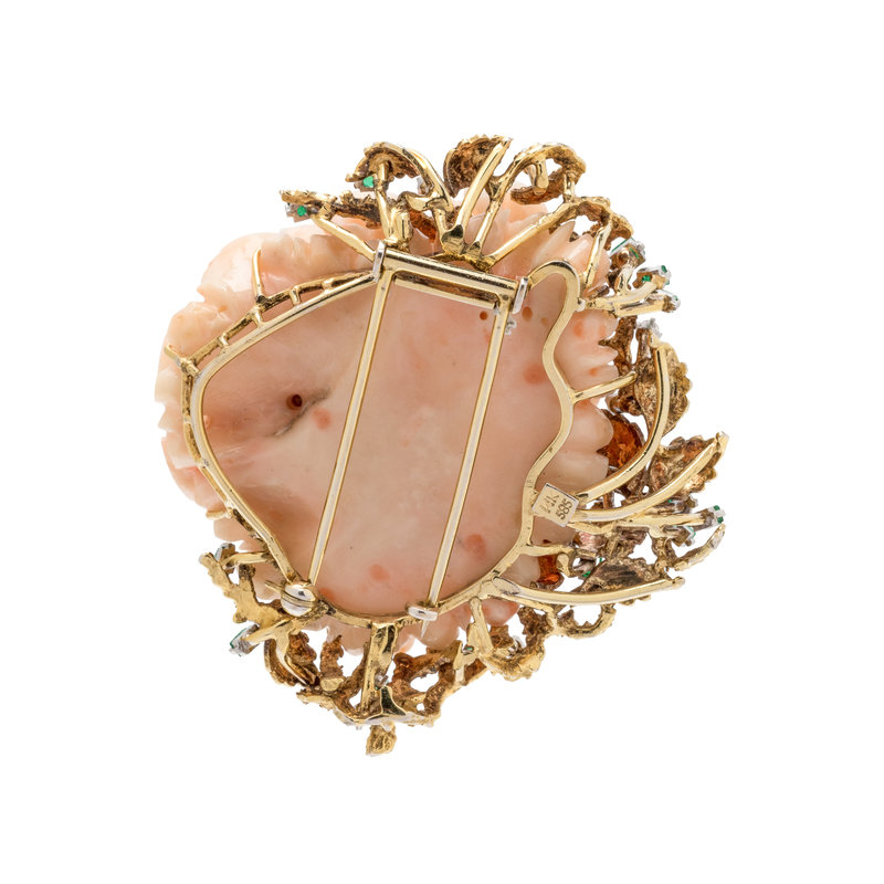 Containing one carved angel skin coral flower, 14 rectangular emeralds and nine round brilliant cut diamonds. Mounted in yellow gold. 2 1/4 x 2 1/4 inches.