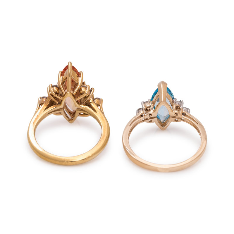 Consisting of a marquise cut topaz measuring approximately 18.00 x 6.00 mm and 10 round brilliant cut diamonds, together with a ring containing one marquise cut blue topaz measuring approximately 11.50 x 6.00 mm and six round brilliant cut diamonds. Mounted in yellow gold. Ring sizes 4 1/2 and 7.